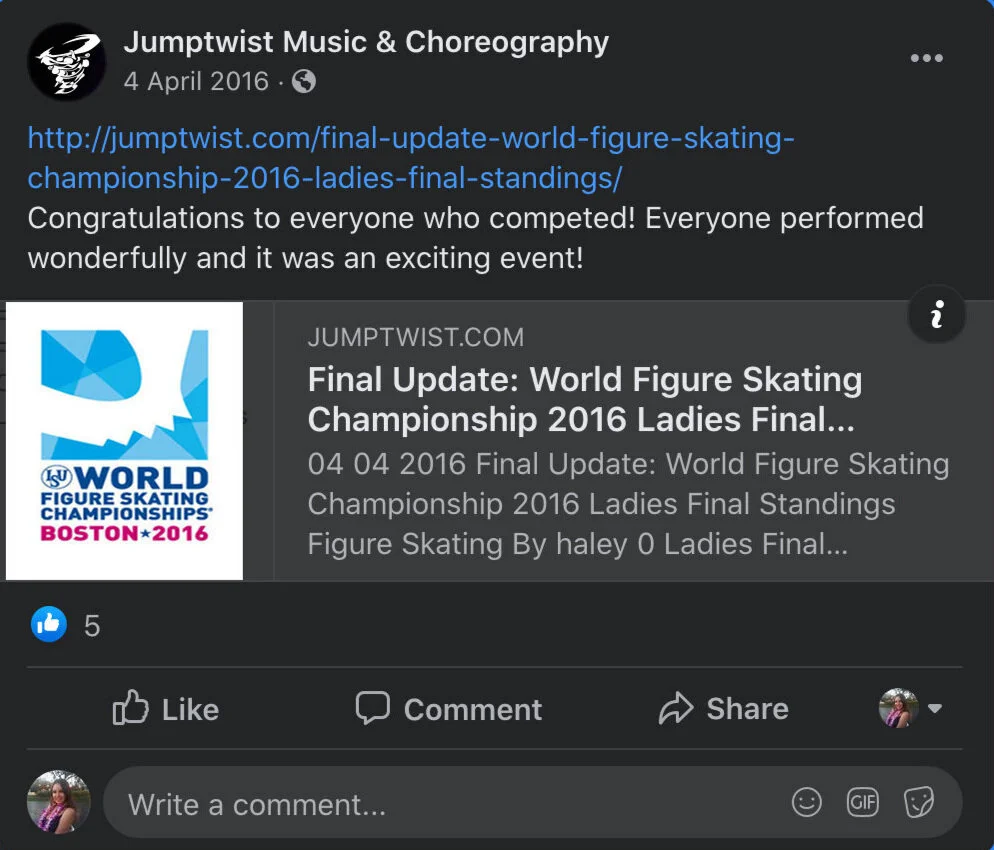 Jumptwist specializes in creating floor music and choreography for gymnasts across the world. I wrote blog posts on the website and posted the links to social media such as Facebook and Instagram. For my position I also wrote additional posts about other sports that had musical requirements. The idea was to branch out to new audiences so we could create routine music for a wider variety of sports.