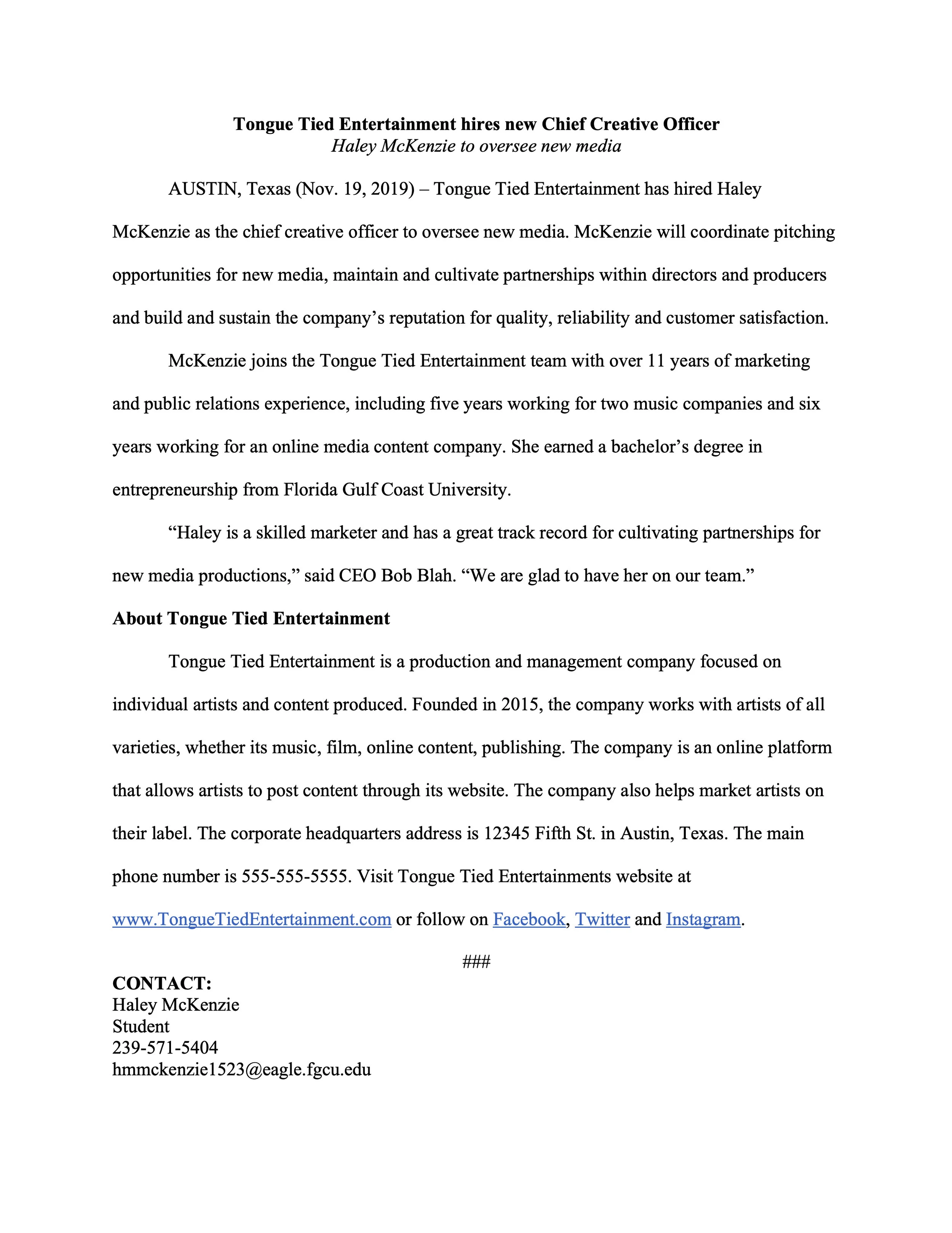 Here are some PR writing samples of mine that I wrote in some of my PR classes.