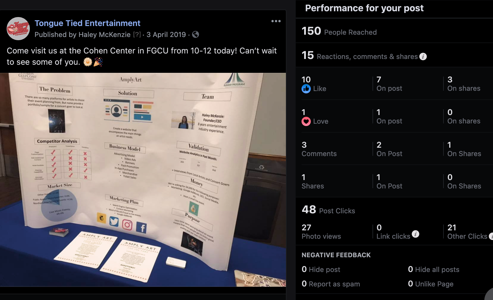 During my time participating in FGCU’s Runway Program, I promoted my startup using Facebook, Instagram and Twitter. I also designed the companies logo, the monthly newsletter, the website and created a budget plan for the startup. As well as reached out to local consumers and companies in order to obtain market research for what their needs were.